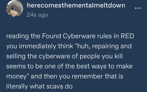 arrow-up1302imageAccidental Villainy [Cyberpunk RED]lemmy.blahaj.zonetgirlschierke@lemmy.blahaj.zoneEnglish · 5 days agomessage-square23fedilink