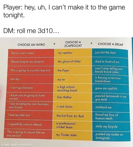 Dazharion@lemmy.dbzer0.com · 7 days agoCan't make it? Finelemmy.dbzer0.comimagemessage-square30fedilinkarrow-up1312