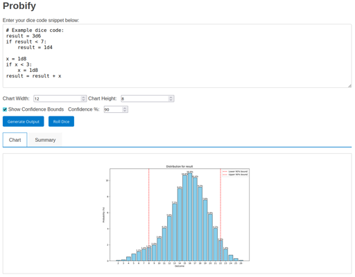 I made a web page where you can simulate a complex dice roll sequence with conditionals (e.g. re-roll when roll is a 1) using a Python-like syntax. (Click the “Toggle Syntax” button to view examples)