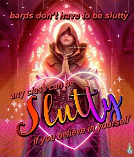In pathfinder you can even be a cleric of the goddess of bdsm and revenge. Or of the drunken god of revelry. Or be basic and just be a slutty cleric of Serenrae, Desna, or Shaelyn, all three of the good triad are down with whatever freak you play as long as they’re good. You could also go darker and have your character be slutty to reclaim that about themselves as a cleric of Arazni.
