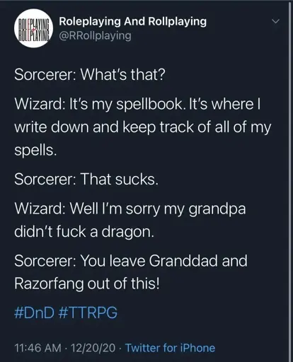 arrow-up1369imageThe Wizard and Sorcerer beef continueslemmy.dbzer0.comStamets@lemmy.dbzer0.com to RPGMemes @ttrpg.network · 1 month agomessage-square9fedilink
