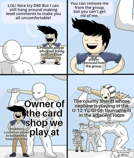 I always thought the spiked bat guy was supposed to be threatening the regular bat guy. Hopefully in this version of the meme he’s just waiting in line to threaten the pompadour guy.