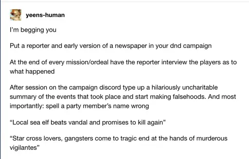 Stamets@lemmy.dbzer0.com to RPGMemes @ttrpg.network · 1 day agoEXTRA EXTRA! READ ALL ABOUT THOSE DUMB FUCKS!lemmy.dbzer0.comimagemessage-square35fedilinkarrow-up1602