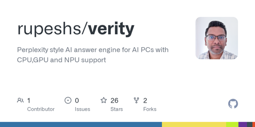 ☆ Yσɠƚԋσʂ ☆@lemmy.ml to Technology@lemmy.mlEnglish · 2 days agoVerity,a Perplexity style AI search and answer engine that runs fully locally with CPU/GPU/NPU accelerationgithub.comexternal-linkmessage-square7fedilinkarrow-up110