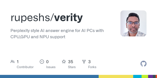 arrow-up110external-linkVerity,a Perplexity style AI search and answer engine that runs fully locally with CPU/GPU/NPU accelerationgithub.com☆ Yσɠƚԋσʂ ☆@lemmy.ml to Technology@lemmy.mlEnglish · 11 days agomessage-square7fedilink