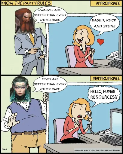 I feel like the dwarf would start calling _you_slurs and would be getting proper firey and the elf wouldn’t care, not because they’re enlightened or anything, but because they don’t see you as a person and therefore don’t care about your opinion.