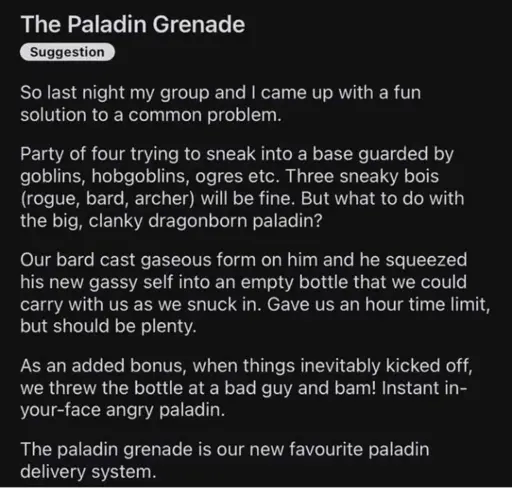 Stamets@lemmy.dbzer0.com to RPGMemes @ttrpg.network · 1 month agoThe Paladin Grenadelemmy.dbzer0.comimagemessage-square17linkfedilinkarrow-up1479
