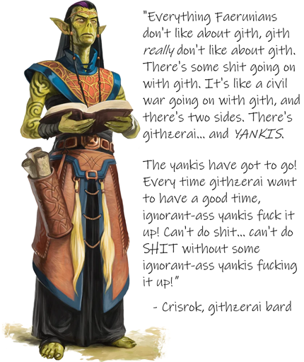 The other reference you need besides the backstory of the Gith schism is Chris Rock’s infamous routine from his 1996 special Bring the Pain, which I will not link but is all the info you need to find it.