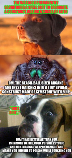 Throws. Her spell list seemed to be largely summoning, support and Insect Plague as an AoE, but the Plague hadn’t been doing much to me by luck, so she only had Ray of Sickness as a direct damage spell. And because of my little spider construct, I am immune completely to poison