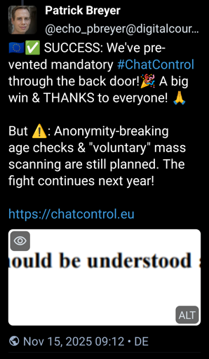 io@piefed.blahaj.zone to Privacy@lemmy.worldEnglish · 1 month agoChatcontrol news!plus-squarepiefed.cdn.blahaj.zoneimagemessage-square7fedilinkarrow-up1350